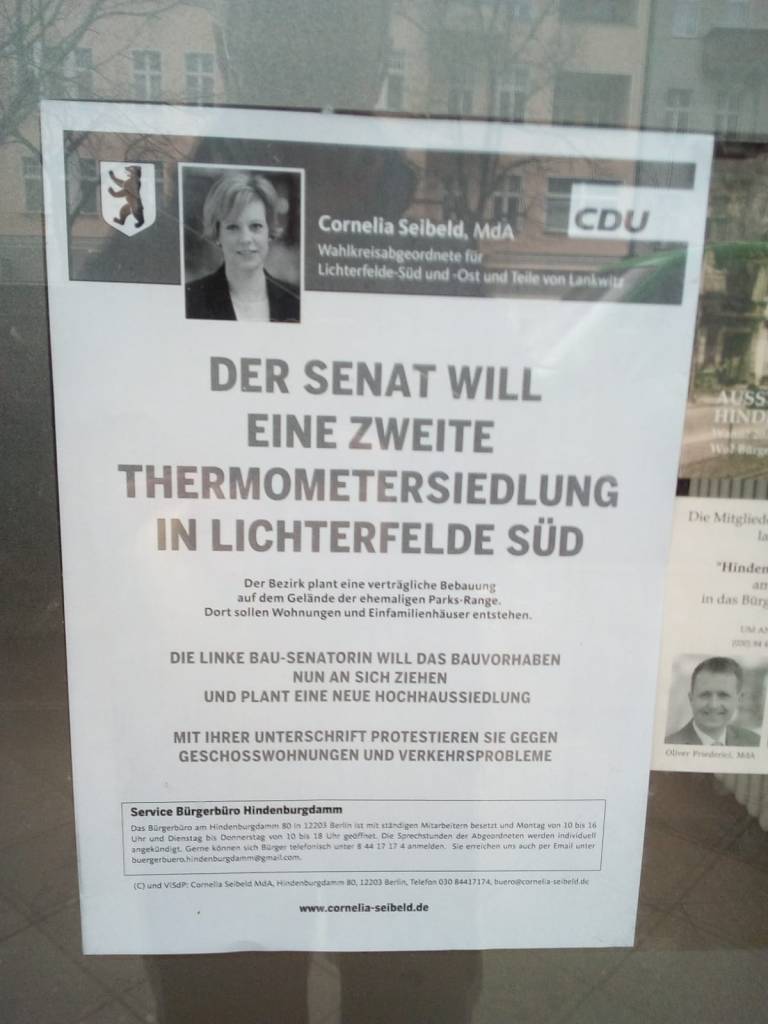 Frau Seibeld versteht die Welt nicht mehr. Sie versteht nicht, dass die linke Senatorin gegen den Bau von Einfamilienhäusern Einwände hat. Senatorin Lompscher will „Geschosswohnungen“ in Lichterfelde Süd, weil dann mehr Wohnungen auf die gleiche Fläche gebaut werden könnten und dass viele neue Wohnungen gebraucht werden, vor allem bezahlbare, bestreitet auch die CDU nicht. Oder möchte Frau Seibeld noch mehr Natur zerstören als selbst der Baulöwe Groth vorhat? Frau Seibelds Parteifreund Herr Hippe hatte ursprünglich das gesamte 96 ha große Grundstück der Groth-Gruppe mit 1.600 Einfamienhäusern vollstellen wollen. Mit „letter of intent“ verständigte sich das schwarz-grün geführte Bezirksamt dann mit der Groth-Gruppe, auf 39 ha 2.200 – 2.700 Wohnungen zu errichten. Zur Erinnerung; das Aktionsbündnis war stets der Ansicht, dass nicht 39 ha bebaut werden sollten, sondern 16 ha wie es im Gutachten von Fugmann & Janotta vorgeschlagen wurde.